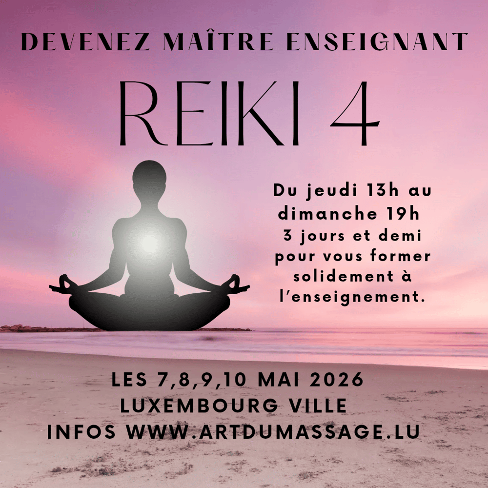 Le 4eme degré vous permet de devenir "Maître enseignant" et donc d'initier aux 4 degrés du Reiki. J'ai décidé de consacrer 3 jours et demi à cette dernière initiation, car je rencontre beaucoup de personnes qui sont initiées au 4ème degré mais qui n'osent pas enseigner. J'ai envie de prendre le temps pour vous apprendre surtout comment structurer un cours, comment enseigner et transmettre. Je veux qu'au bout de ces 3 jours et demi vous vous sentiez complètement capables! nous allons donc bosser dur!!!